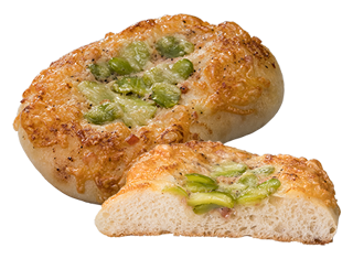 米こうじ入りの発酵風味料を配合したフォカッチャ生地に、角切りベーコンとブラックペッパーを配合したフィリングをのせ、そら豆をトッピングして焼き上げました。