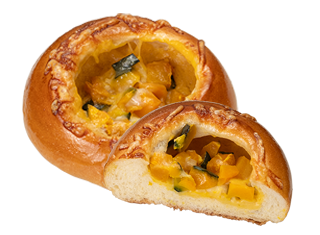 かぼちゃパンはちみつ入りの菓子パン生地に、北海道産えびすかぼちゃのパウダー入りクリームを使用したかぼちゃフィリングを包み、かぼちゃそっくりな見た目に仕上げました。